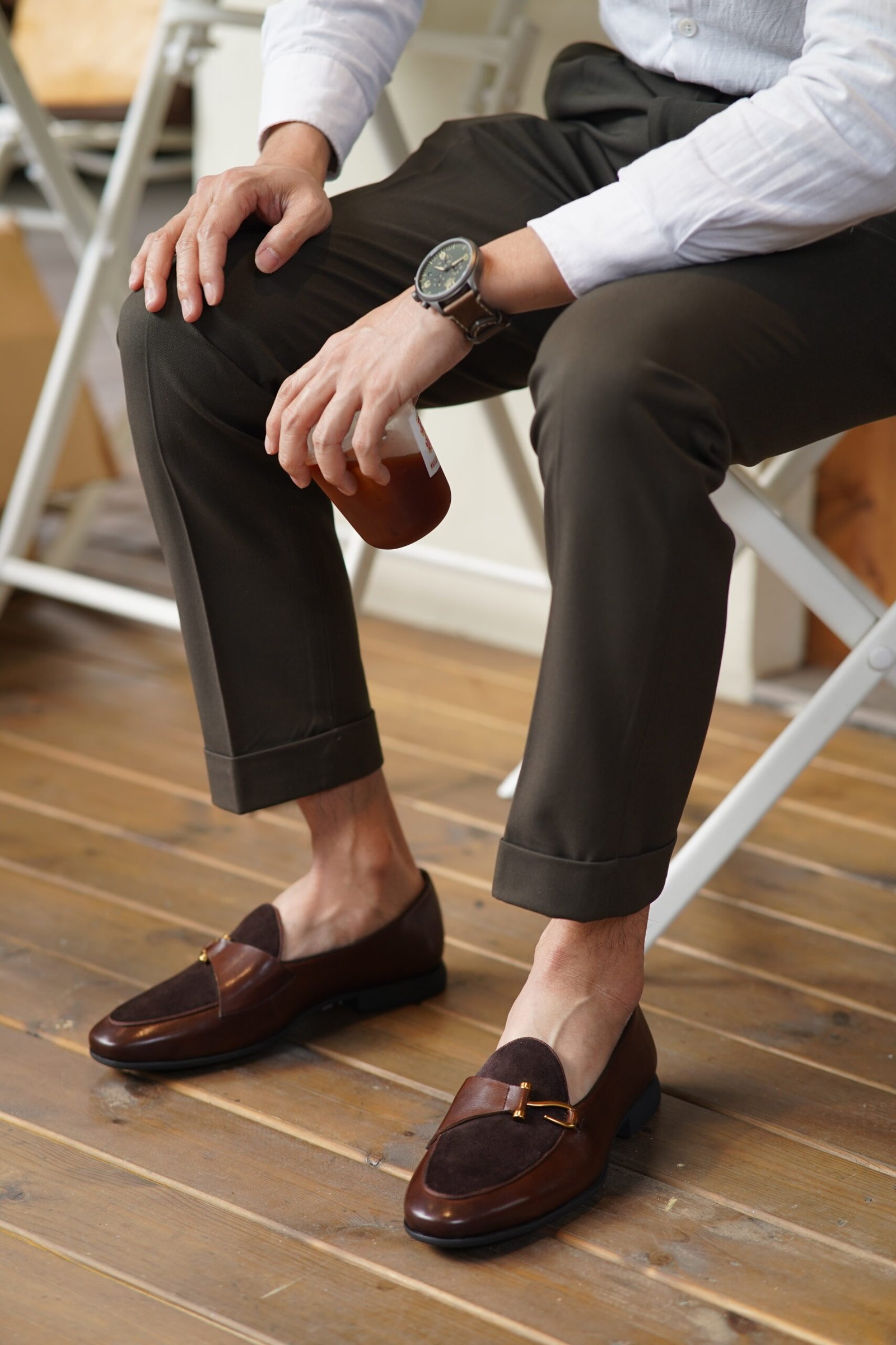Elevate your smart-casual style with these Brown Leather & Suede Bit Loafers, blending luxury materials and timeless design. Crafted from smooth brown leather and soft suede, the dual-texture finish offers depth and sophistication, while the gold-tone horsebit hardware adds a refined touch of elegance.
